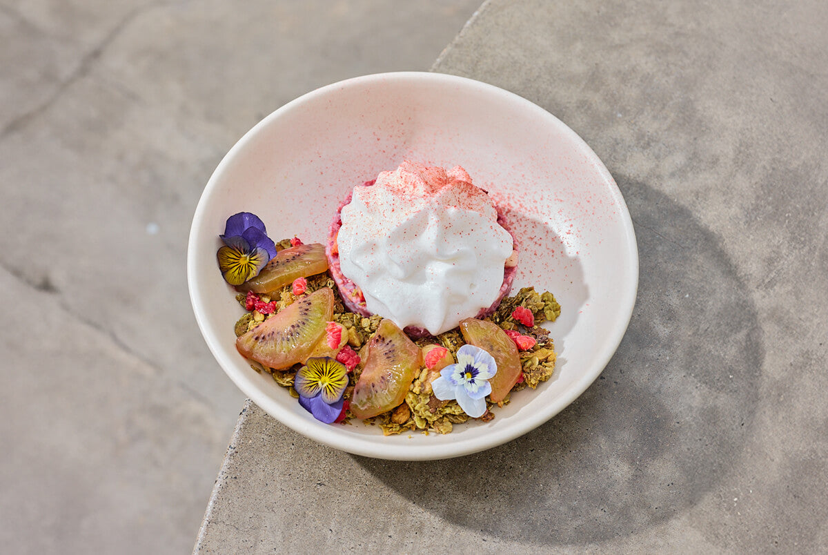 Lychee, coconut, raspberry and cranberry steel cut oats, matcha granola, strawberry compressed kiwi fruit, coconut foam, passionfruit gel and raspberries