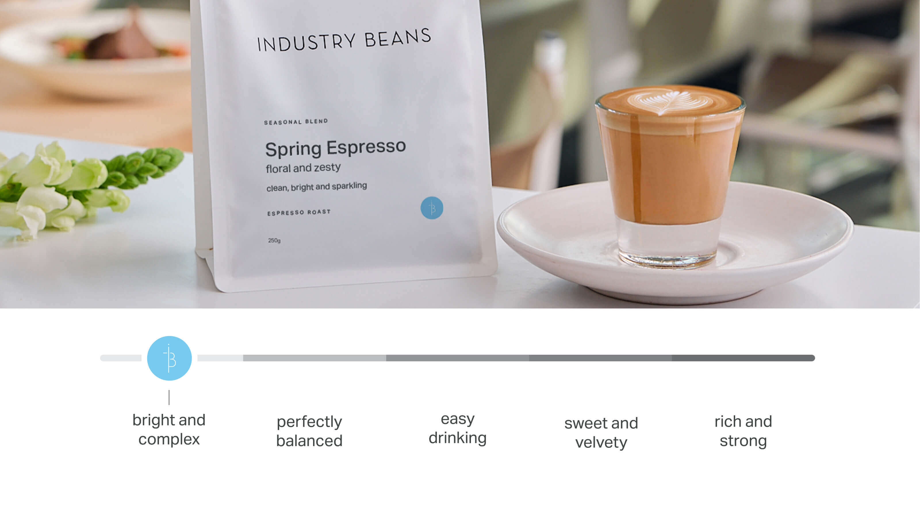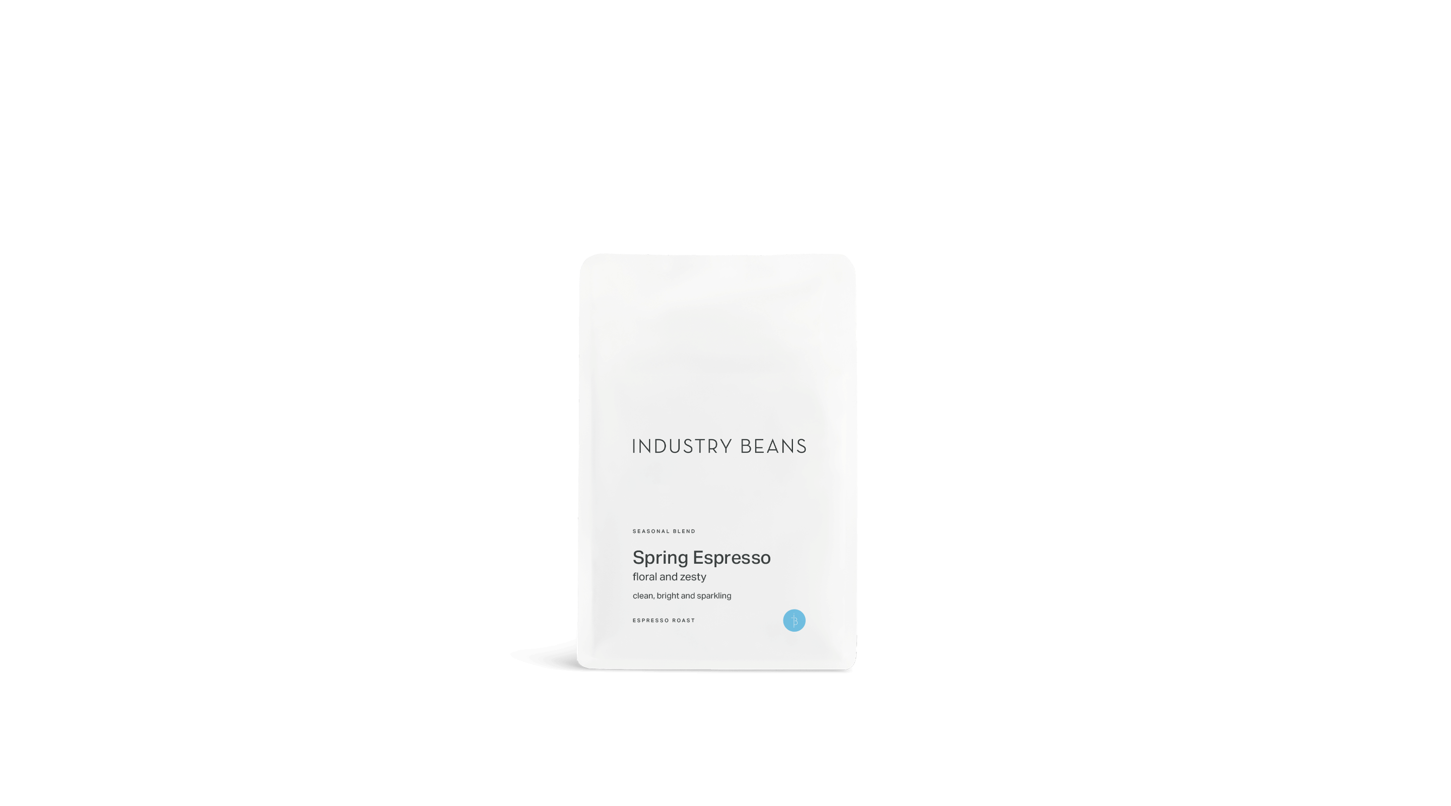 Bag of 'Industry Beans Spring Espresso' with a cup of coffee on a table.